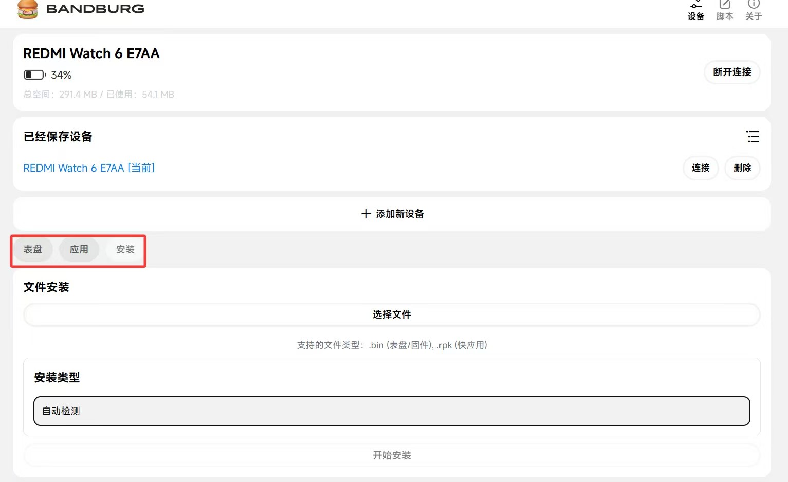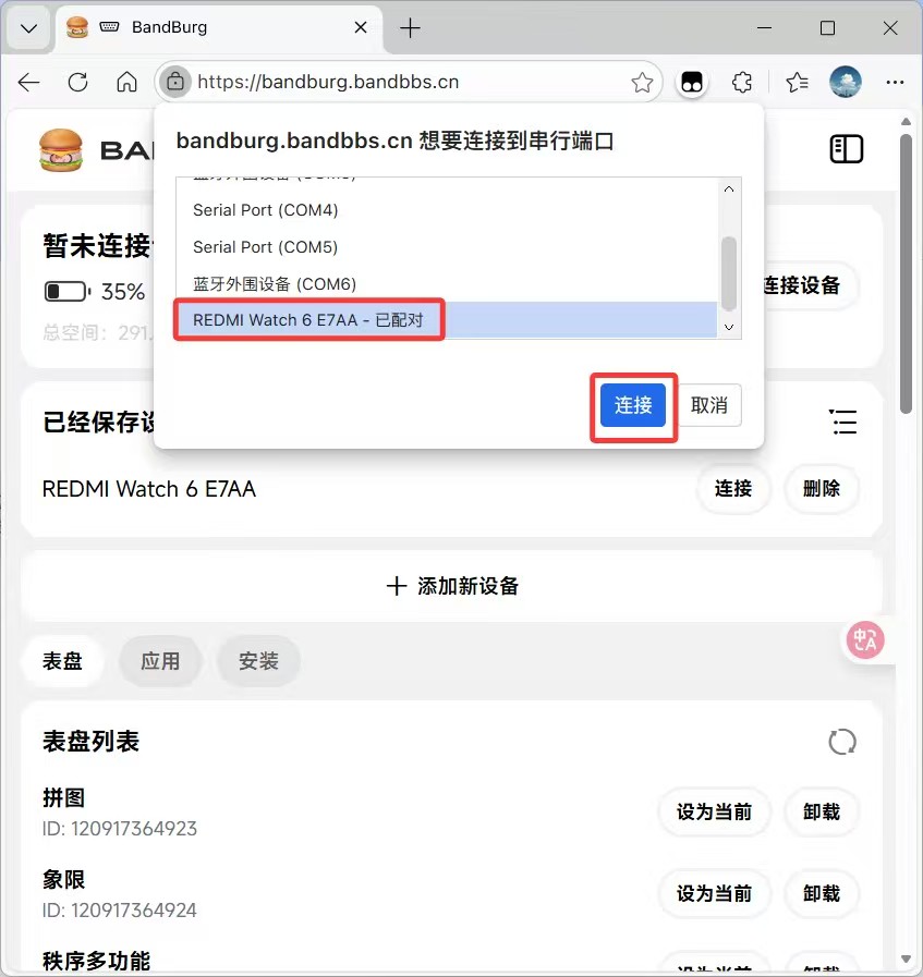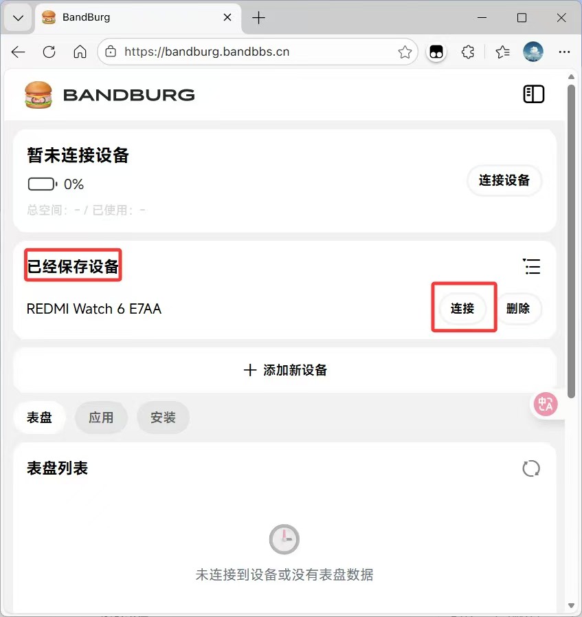 连接成功,点击下方区域可管理表盘、应用。和安装表盘、应用、固件。